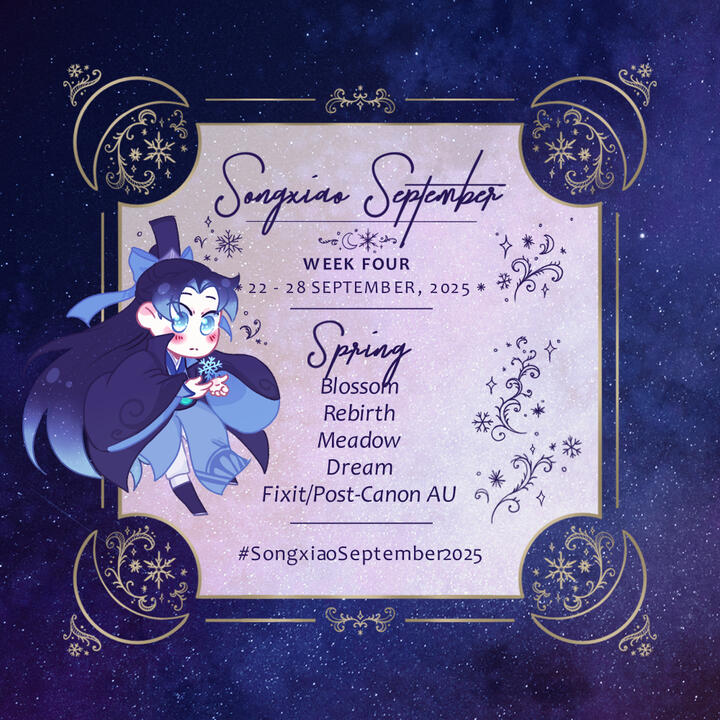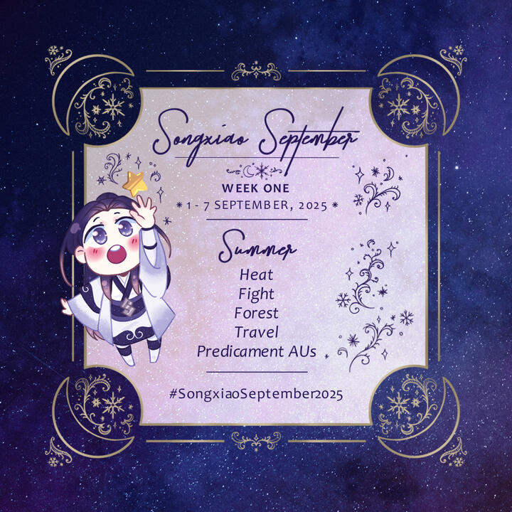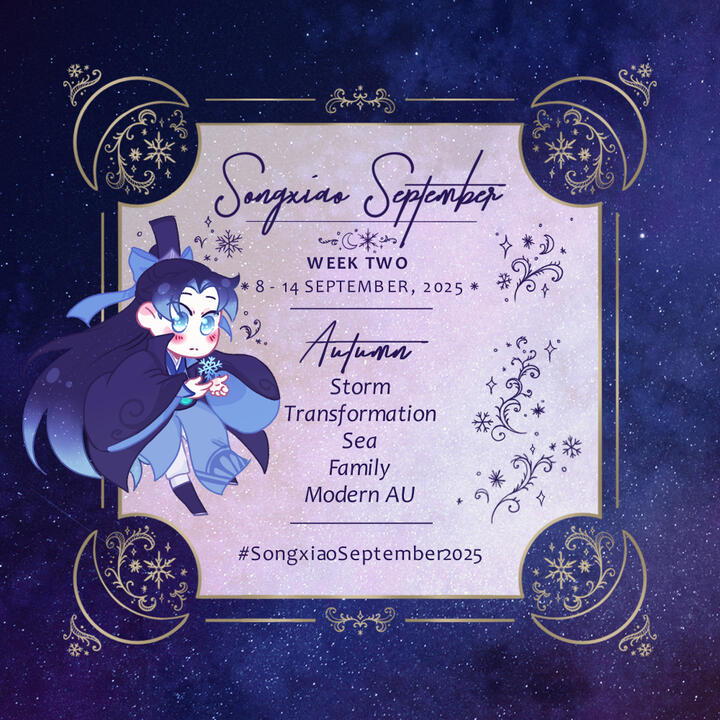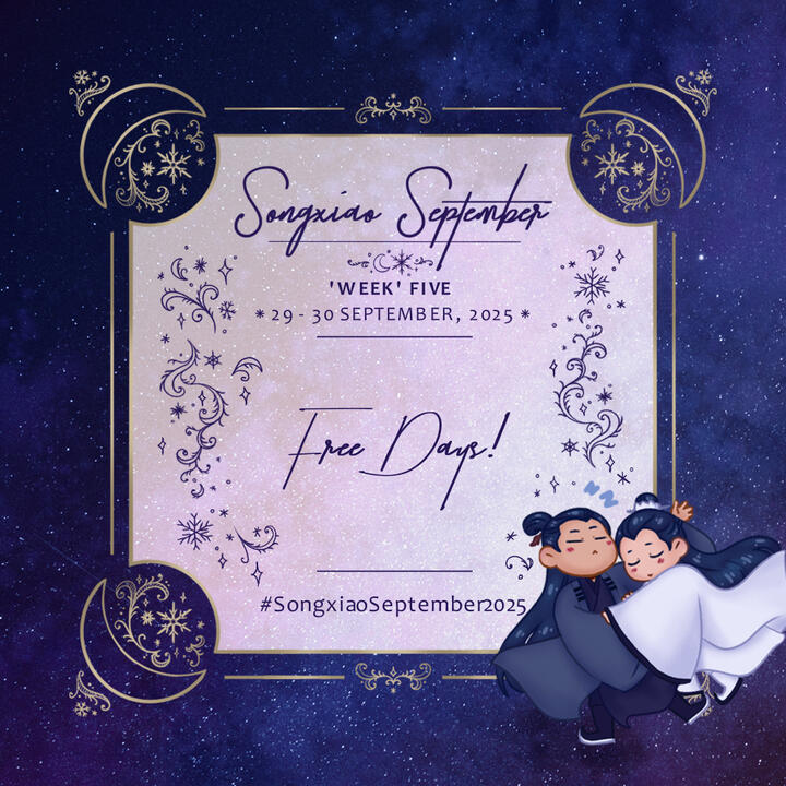 Welcome to Songxiao September! This is a month-long ship event, running from September 1 – September 30, 2025, dedicated to Song Lan/Xiao Xingchen from Modao Zushi/The Untamed.It’s been quite some time since we’ve seen a Songxiao-focused event, at least in the English-speaking MDZS fandom, and we wanted to change that! Throughout the month of September, we will be celebrating our two beloved daoshi and the complexities of their relationship with each other. There will be suggested themes for each week of the month with a handful of other guiding prompts to get your creative gears turning, but anything Songxiao-focused is fair game!Before participating, please read through this carrd, where you'll find some important guidelines as well as prompts for each week of the event.All types of Songxiao-centric fanworks are welcome! Fic, art, podfic, playlists, video edits, music, cosplay, handicrafts... we want to see it all. If you post your work for this event to AO3, please go ahead and add it to the collection- which you can find under socials!REMEMBER to tag your works with #SongxiaoSeptember2025 so we can find them!